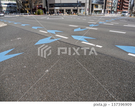 交差点の路面に表示された青い矢羽根マーク「自転車ナビライン」。(東京都内)