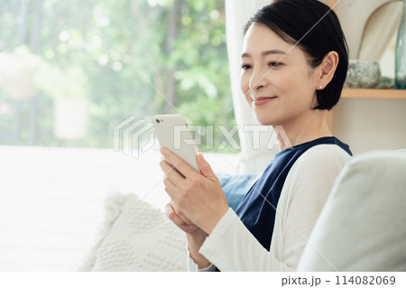 リビングでスマートフォンを操作する主婦