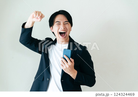 ガッツポーズをするスマホを持つ男性
