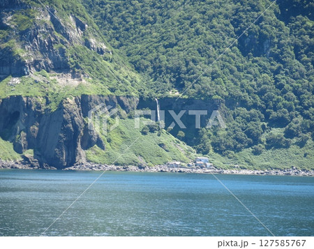 知床観光船おーろら(秘境知床岬航路)から見たチャラセナイの滝と滝の下の番屋