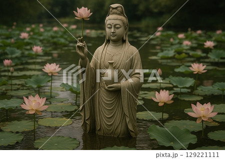 Majestic statue of guanyin serene garden peaceful environment low angle spiritual enlightenment