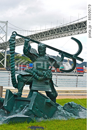 「体に碇を巻き付けた平知盛」の像(みもすそ川公園/山口県下関市みもすそ川町)