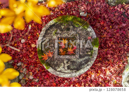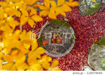 手水鉢ともみじ 秋イメージ 秋の京都 紅葉とお寺 吾唯知足 イメージ素材 背景素材