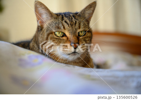 ベッドのトラ猫の顔