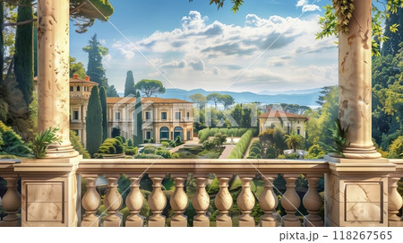 A classical stone balustrade with fluted columns and acanthus leaves frames a panoramic view of a grand villa.