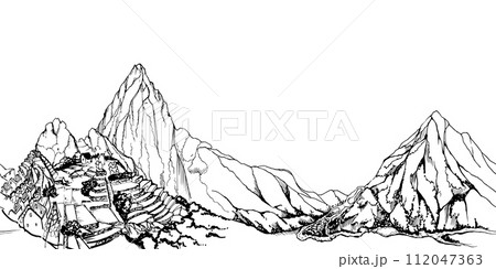 Hand drawn ink vector illustration, mountain landscape scenery Central South America, Machu Picchu terraces. Seamless banner isolated on white background. Design travel, vacation, brochure, print