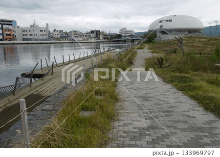 石巻中瀬の石ノ森萬画館と北上川