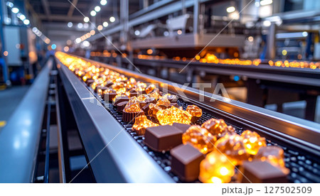 Chocolate factory conveyor belt with glowing candy geodes cracking open. Generated Image