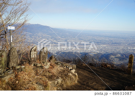 群馬県 渋川市 人気の低山 水沢山 見晴台石仏のピークから石仏と渋川市方面の眺望