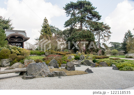 石庭と勅使門のもうけられた木々に囲まれた日本庭園 ロンドン郊外のキューガーデンにて