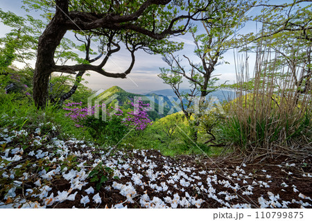 シロヤシオツツジ咲く丹沢山地・檜洞丸稜線から見る朝の石棚山