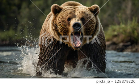至近距離のクマ_攻撃態勢にある獰猛なヒグマ/ツキノワグマ