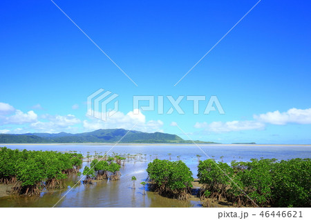 沖縄県小浜島 石長田海岸のマングローブと青空と雲