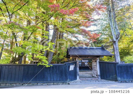 秋景色の角館武家屋敷 石黒家薬医門とのぞき窓の付いた黒板塀