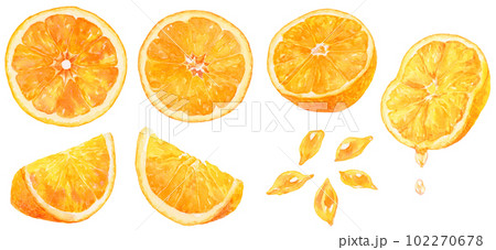 水彩で描いたカットオレンジ(みかん)のイラストセット