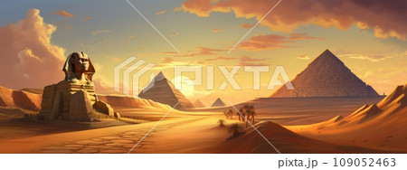 スフィンクスとピラミッドが並ぶエジプト風のパノラマ:AI作品