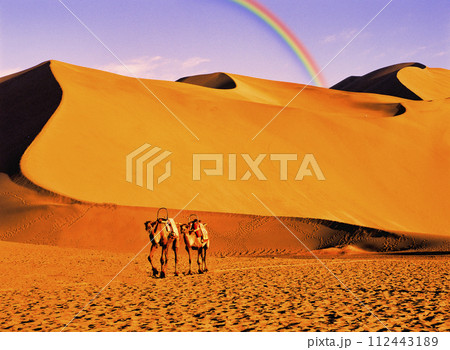 敦煌の鳴沙山の砂丘上空にかかる虹
