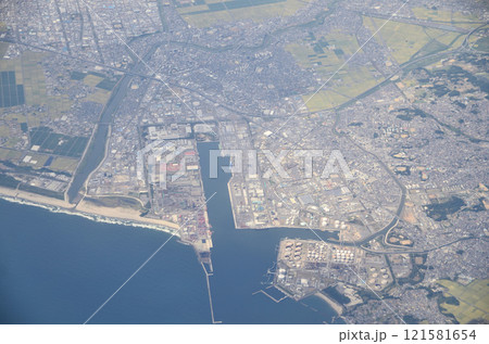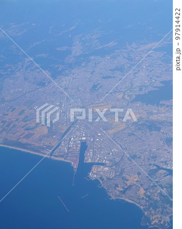 航空機で東方向の海上上空から見た仙台港から仙台市中心部方面