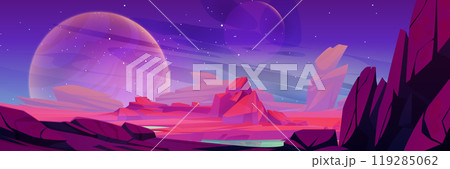 Alien planet landscape with rocky surface and lake
