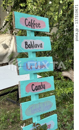 Colorful wooden signpost with dessert and beverage names in outdoor garden setting