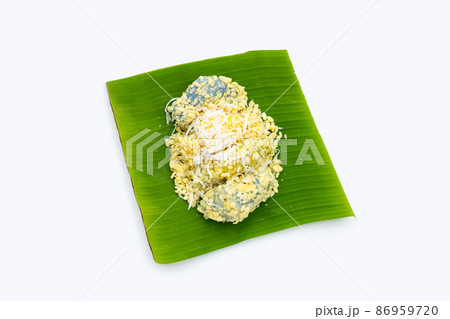 Pandan and coconut jelly on banna leaf in plate
