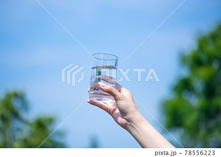 空にグラスを持って手をかざす