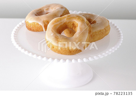 ケーキスタンドに盛り付けられたハニーグレーズドーナツを白背景で撮影