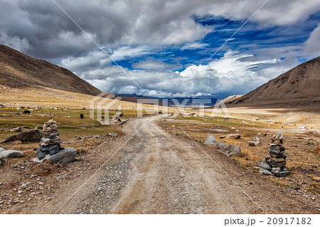 Dirt road in Spiti valley in Himalayas. Spiti valley, Himachal Pradesh, India