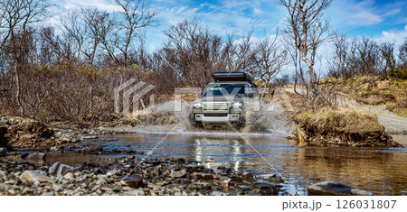 Off road tourist car rides off-road in the highlands. Expedition travel and vacation, adventures in remote areas.