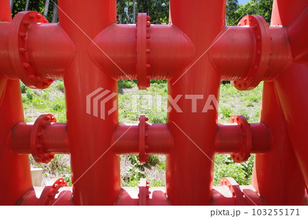 信州 小谷村の砂防施設 ガン沢砂防堰堤 朱色の大規模鋼製スリットが特徴的