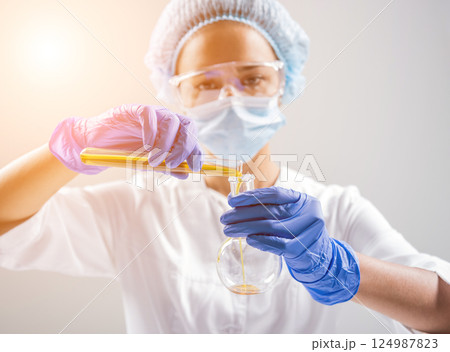 Female scientist wearing a face mask and blue gloves, carefully dropping liquid from a pipette into a test tube in a modern lab. Medicine, healthcare and science concept
