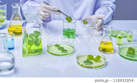 A photo captures the full tabletop with instruments and specimens for the centella experiment from a high viewpoint. A scientist is picking up centella leaves from a solution and placing a petri dish.