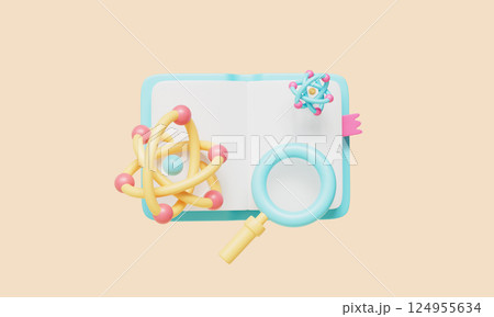 Atom Science Book and Magnifying Glass Icon. 3D Rendering