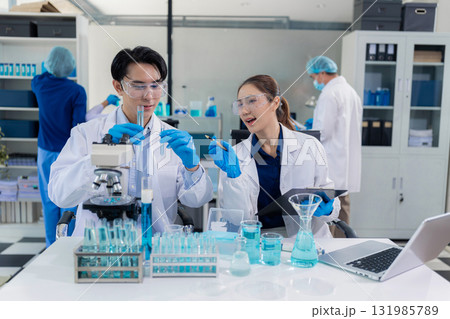Chemist scientist holding test tube and tablet conducting experiment in laboratory with equipment, science concept.