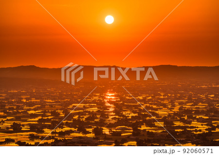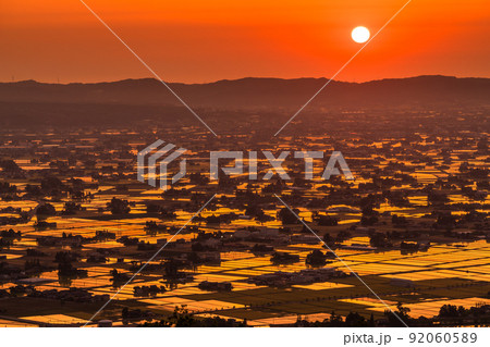《富山県》水鏡の田園風景・散居村展望広場の夕暮れ