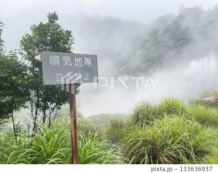鹿児島県霧島市にある硫黄谷噴気地帯公園。"噴気地帯、立入禁止"という看板。