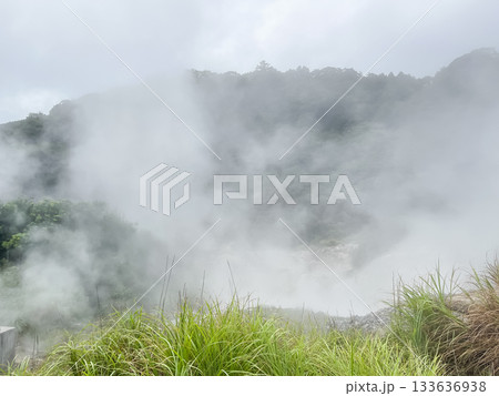 鹿児島県霧島市にある硫黄谷噴気地帯公園。硫黄ガスが山に沿って噴き出している様子。