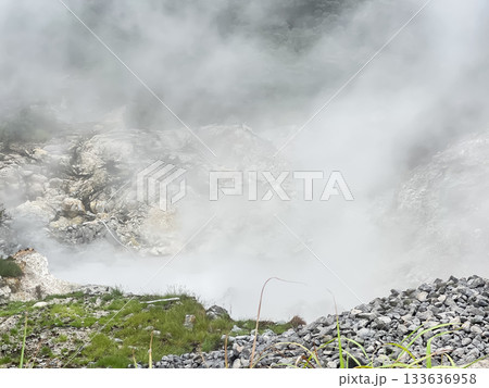 神奈川県観光スポット・大涌谷駅下から見える大涌谷の噴気孔と火山ガス・横位置