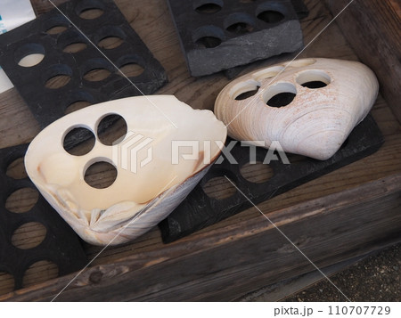 碁石をくり抜いた黒石とハマグリ