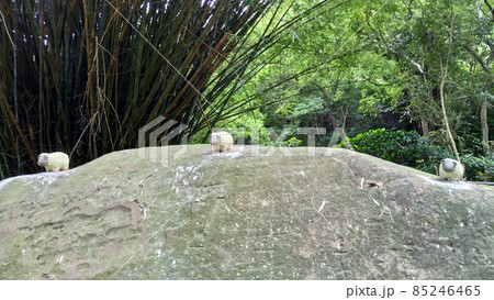 山の中の石の上に置いてある3匹の羊の人形