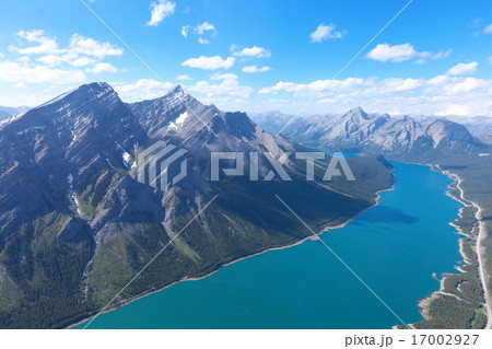 Maligne Lake summer scenery in Jasper National Park, Alberta, Canada. Canadian Rockies snow capped mountain range panoramic view.