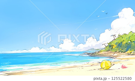 夏の青い空、青い海、白い雲と砂浜のコントラスト(クレヨン+水彩画風)