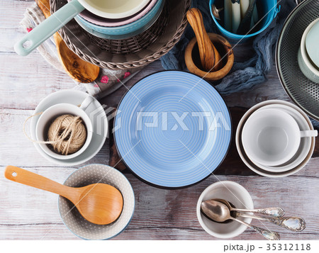 Ceramic and enamel crockery on wooden background