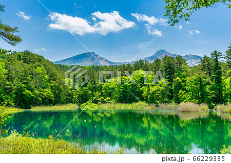五色沼自然探勝路の新緑風景 るり沼と磐梯山 福島県北塩原村