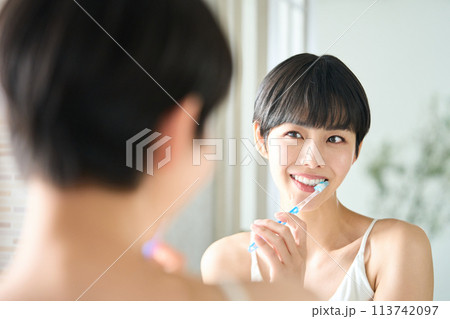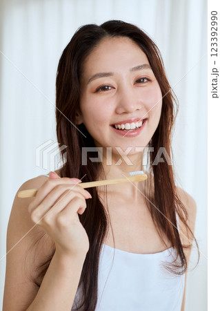 自宅のリビングで舌磨きをする若い女性 顔無し