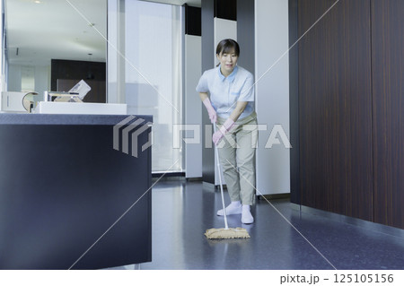 ビル清掃イメージ フロアのモップかけをする50代の女性清掃スタッフ