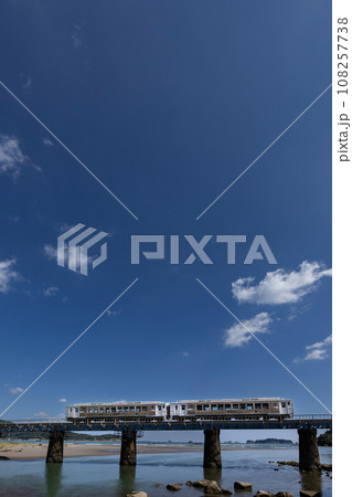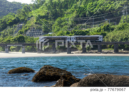 宮崎県日南市細田川河口から広がる日南海岸大堂津海水浴場とJR九州日南線橋梁を走る通勤列車のキハ40
