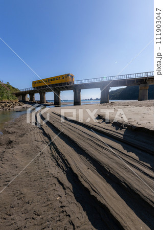 砂模様と青空の下鉄橋走るJR九州日南線黄色いDLキハ40