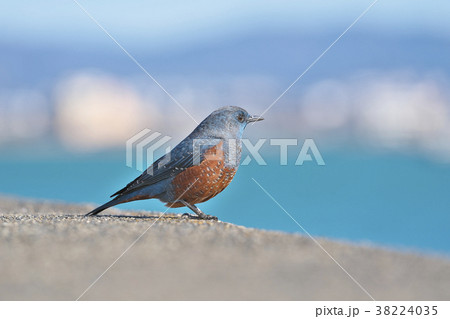 生き物 野鳥 イソヒヨドリ、体長二十五センチ程。オスは青と赤の美しい鳥、メスはいたって地味