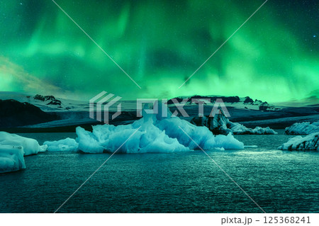 Aurora borealis, Northern lights glowing over abstract iceberg in Jokulsarlon glacier lagoon